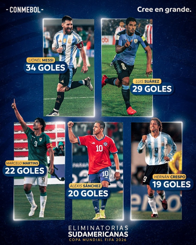9月5日訊 南美足聯(lián)官方列出了南美世預賽歷史射手榜,梅西34球居首,蘇亞雷斯29球次席。
