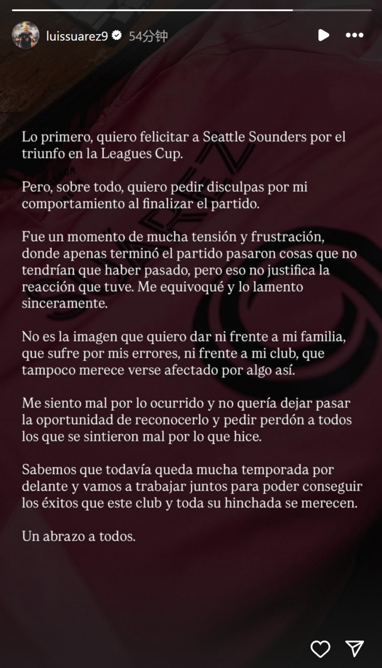 蘇亞雷斯寫(xiě)道:“首先我要祝賀西雅圖海灣人隊贏(yíng)得聯(lián)盟杯冠軍。但最重要的是,我要為自己比賽結束時(shí)的行為道歉。
