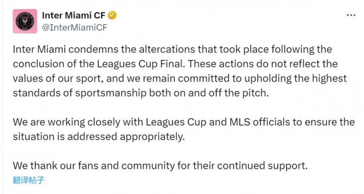 我們正在與聯(lián)盟杯、美國職業(yè)足球大聯(lián)盟官員緊密合作,確保妥善處理此事。感謝我們的球迷和社區一直以來(lái)的支持?!?/p>