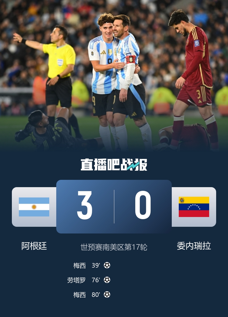 傷停補時(shí)2分鐘。全場(chǎng)比賽結束,阿根廷3-0委內瑞拉。