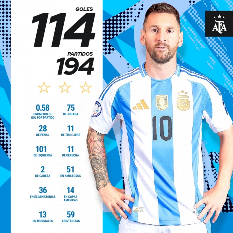9月5日訊 北京時(shí)間今天上午進(jìn)行的南美世預賽,梅西打進(jìn)2球,阿根廷主場(chǎng)3-0擊敗委內瑞拉。阿根廷隊更新社媒動(dòng)態(tài),曬出梅西在國家隊的數據海報。