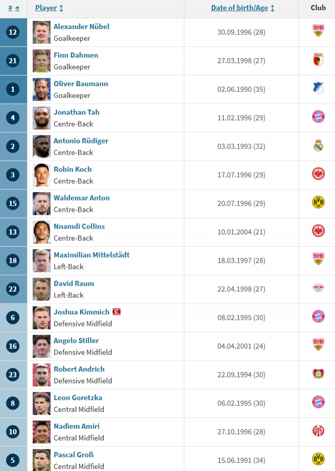 現在這支德國國家隊中已無(wú)一人為2014年世界杯冠軍成員,80后的球員已全部退出國家隊,現在陣容中最年長(cháng)的球員為1990年出生的門(mén)將鮑曼。