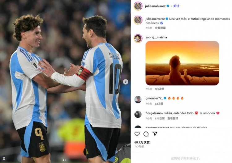 阿爾瓦雷斯在賽后也曬出他和梅西的慶祝照,并配文:“又一次,足球奉上了歷史性時(shí)刻?!?/p>