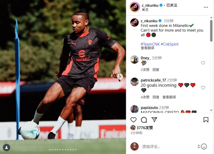 恩昆庫曬出訓練照,并寫(xiě)道:“在米蘭訓練基地的第一周完成,已經(jīng)等不及參與更多的工作,并和你們見(jiàn)面了!”