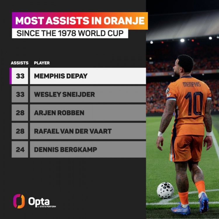 數據統計顯示,自1978年世界杯以來(lái),德佩是荷蘭隊助攻數并列最多的球員。