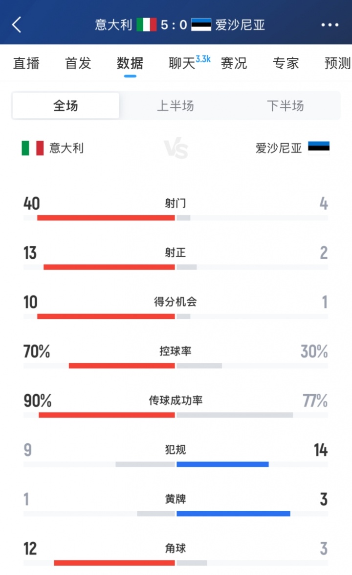 進(jìn)攻方面,意大利射門(mén)數40-4,射正數13-2,得分機會(huì )意大利達到10次??厍蚍矫?,意大利達到70%。