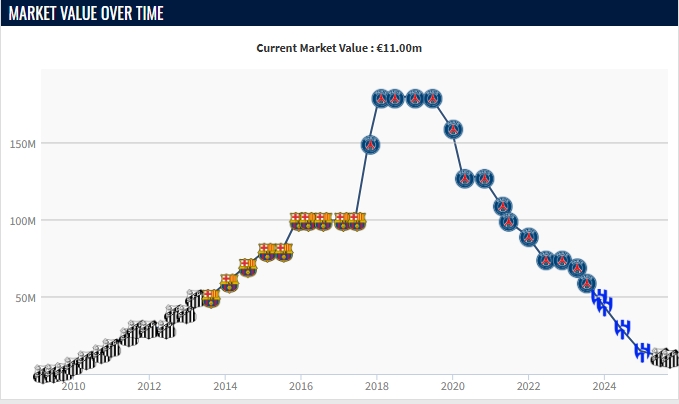 內馬爾的身價(jià)曾在2018-2019年達到巔峰的1.8億歐。但在過(guò)去兩年間,內馬爾的身價(jià)暴跌了4900萬(wàn)歐。