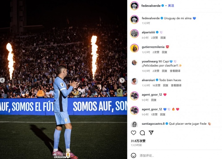 隊長(cháng)巴爾韋德也在賽后通過(guò)社媒曬出自己同現場(chǎng)球迷的互動(dòng)照,并配文:“烏拉圭是我的靈魂所屬”。