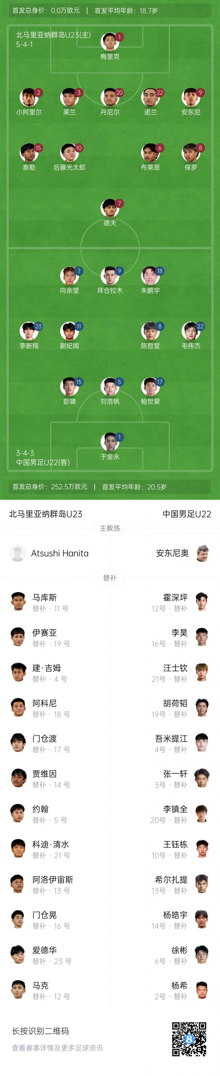 北馬里亞納群島U23首發(fā):1-梅里克-托韋斯、2-小阿里爾-納瓦埃斯、3-利蘭-格雷羅、20-丹尼爾-巴勃羅、22-諾蘭-恩蓋瓦克爾、6-布賴(lài)恩-盧巴奧、7-德夫-巴查尼、9-安東尼-貝爾甘西亞、10-后藤光太郎、15-泰勒-奧梅勞、8-保羅-利薩馬