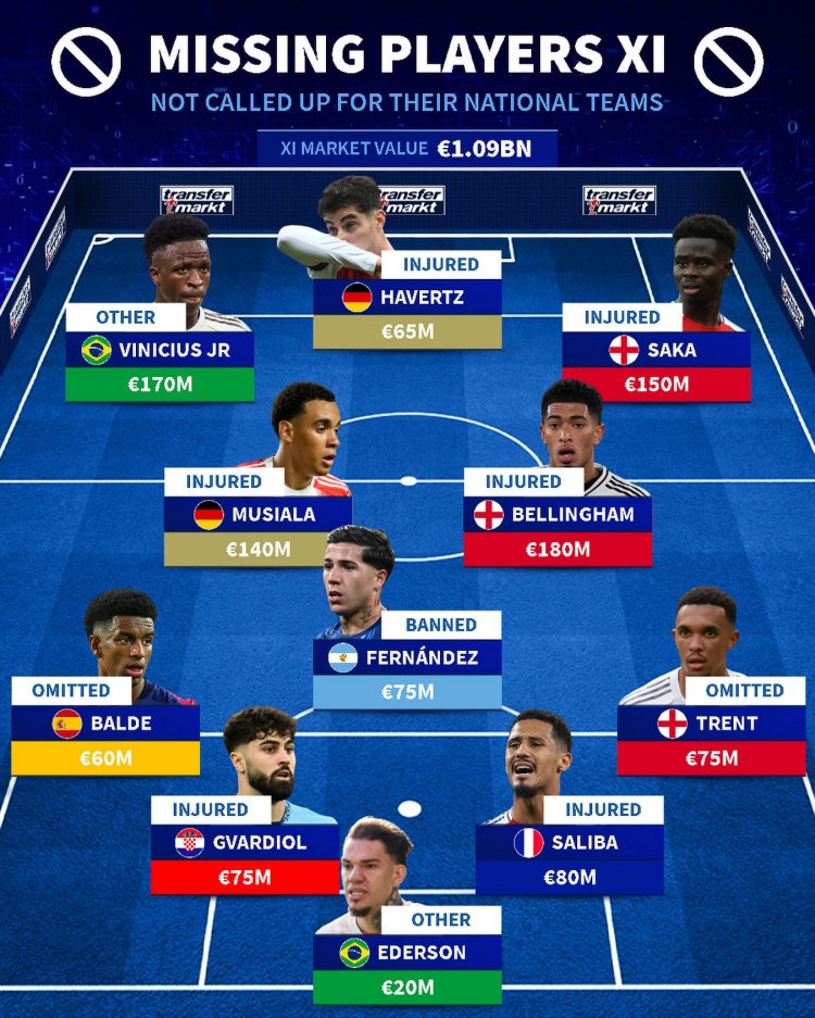 9月6日訊 德國轉會(huì )市場(chǎng)列出了缺席9月份國家隊比賽的球員陣容,維尼修斯、薩卡、穆西亞拉、貝林厄姆在列,德轉總價(jià)10.9億歐。