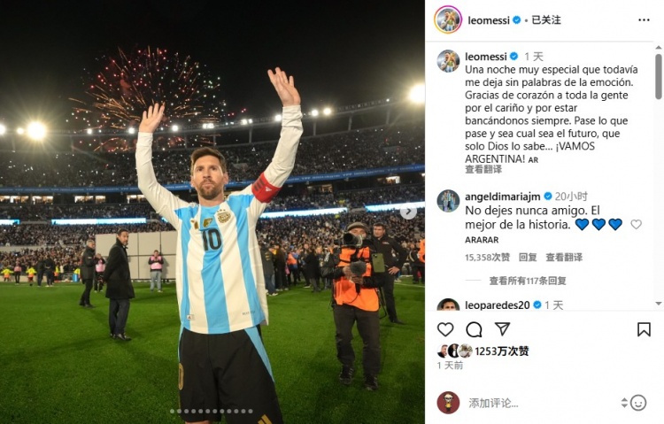 9月7日訊 梅西在Instagram發(fā)文談國家隊主場(chǎng)告別戰,迪馬利亞在評論區送上祝福。