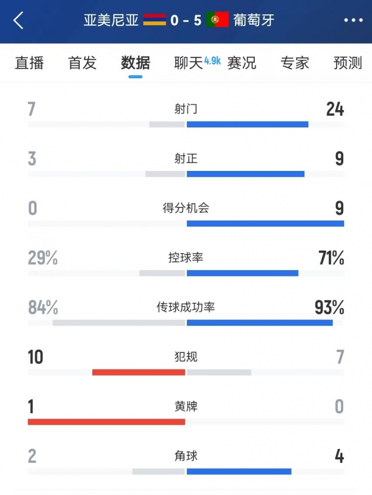 9月7日訊 葡萄牙在本輪世預賽客場(chǎng)5-0大勝亞美尼亞,兩隊全場(chǎng)關(guān)鍵數據如下: