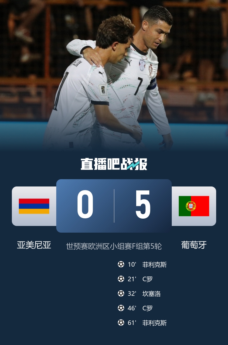 葡萄牙世歐預本輪5-0橫掃亞美尼亞,C羅、菲利克斯雙響,坎塞洛破門(mén)!