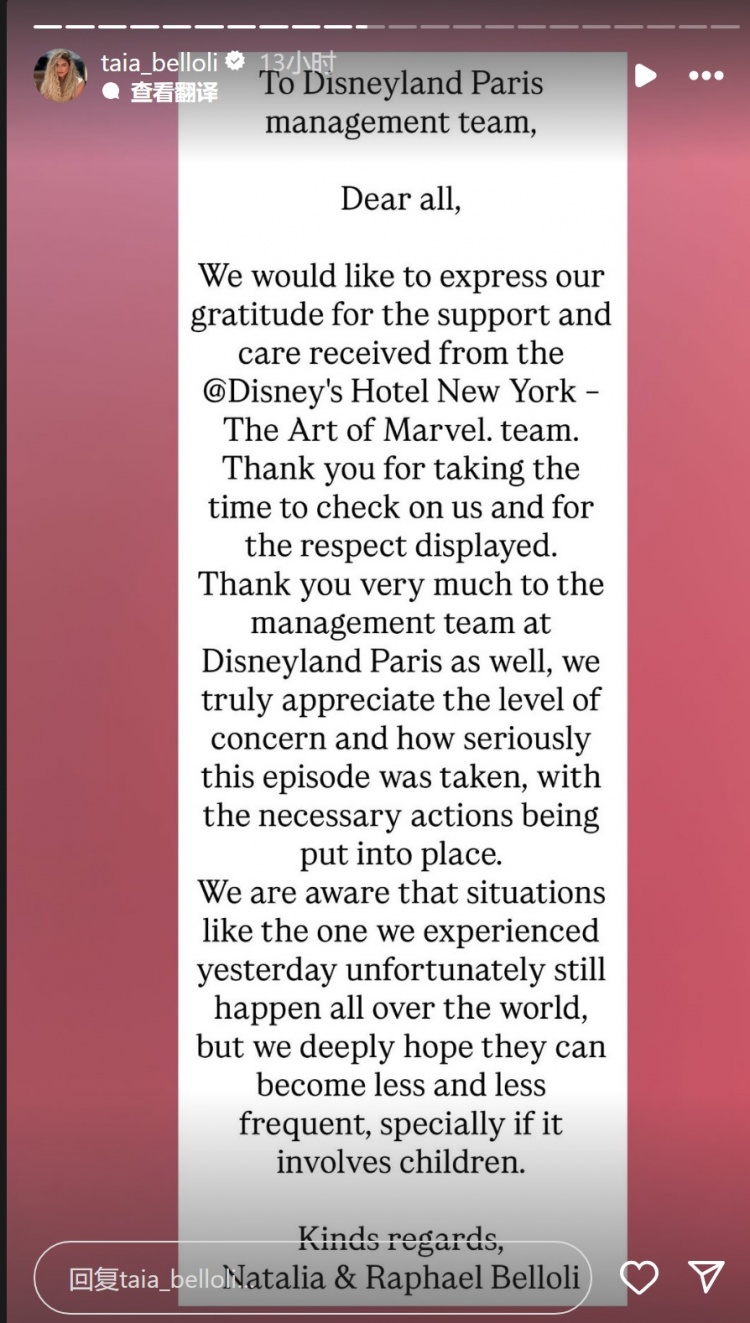 “致巴黎迪士尼樂(lè )園管理團隊,親愛(ài)的各位,我們對紐約迪士尼酒店-漫威藝術(shù)的支持和關(guān)懷表示感謝。感謝你們抽出時(shí)間關(guān)心我們,并展現出尊重。我們也非常感謝巴黎迪士尼樂(lè )園的管理團隊,我們真誠地感激你們對此事件的重視以及所采取的必要措施。