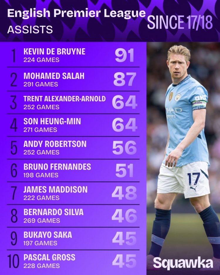 9月7日訊 Squawka統計了2017-2018賽季以來(lái)球員在英超助攻的次數,并列出榜單,德布勞內91助居首,薩拉赫87助次席。
