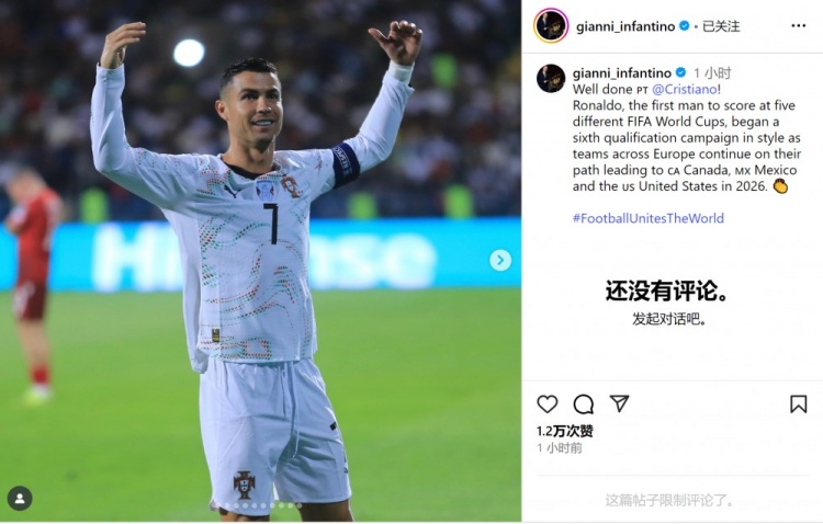 國際足聯(lián)主席因凡蒂諾社媒曬出C羅的照片,并寫(xiě)道:“干得漂亮,克里斯蒂亞諾!作為首位在五屆不同世界杯上進(jìn)球的男足球員,C羅以出色的表現開(kāi)啟了第六次世界杯預選賽征程,歐洲各隊正繼續朝著(zhù)2026年世界杯的目標前進(jìn)?!?/p>