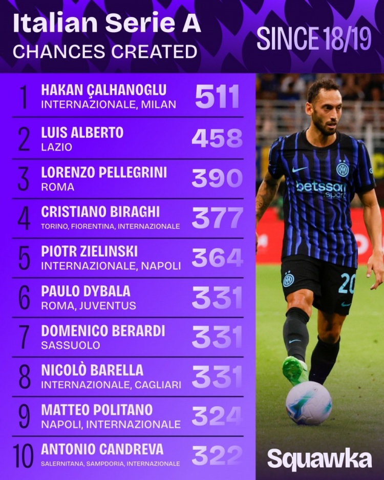 9月7日訊 《轉會(huì )市場(chǎng)》統計了18-19賽季以來(lái)的意甲創(chuàng )造機會(huì )情況,恰爾汗奧盧獨自領(lǐng)跑。