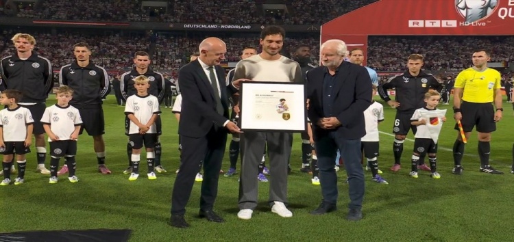 9月8日訊 德國隊在本輪世預賽主場(chǎng)迎戰北愛(ài)爾蘭,主隊賽前為退役的老將胡梅爾斯舉辦了致敬儀式。