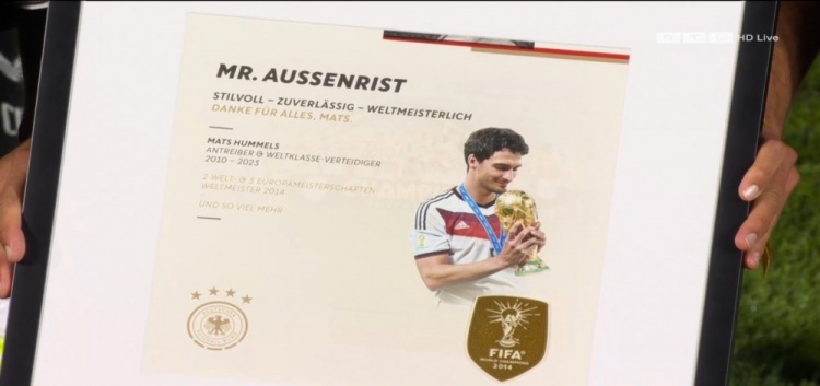 德國足協(xié)向其贈送了印有胡梅爾斯手捧大力神杯的感謝信,其內容為: