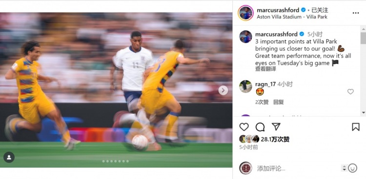 拉什福德社媒曬出比賽照片,配文:“在維拉公園球場(chǎng)拿下重要三分,讓我們更接近目標!球隊表現出色,現在專(zhuān)注于周二的重要比賽(客戰塞爾維亞)!”
