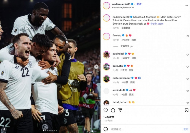 他也在賽后通過(guò)社媒曬出全隊的慶祝照,并配文:“真是讓人雞皮疙瘩都起來(lái)了??我身披德國隊戰袍的首粒進(jìn)球,為球隊贏(yíng)下了三分!無(wú)比激動(dòng),無(wú)比感恩?!?/p>