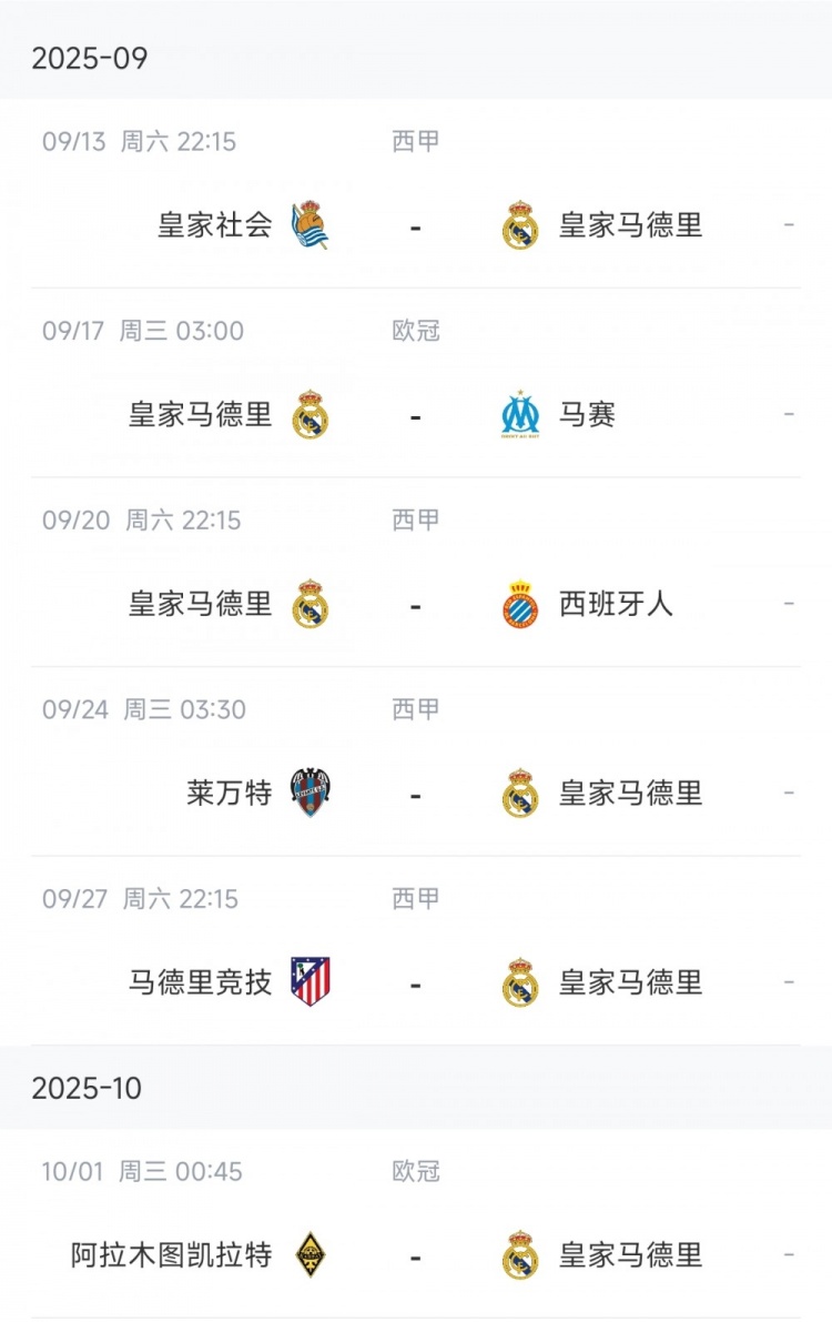 最后兩場(chǎng)則是重頭戲。首先是9月27日的馬德里德比,對手是馬競。隨后皇馬需要遠征8000公里外的哈薩克斯坦,于10月1日與阿拉木圖凱拉特進(jìn)行歐冠小組賽第2輪的對決。