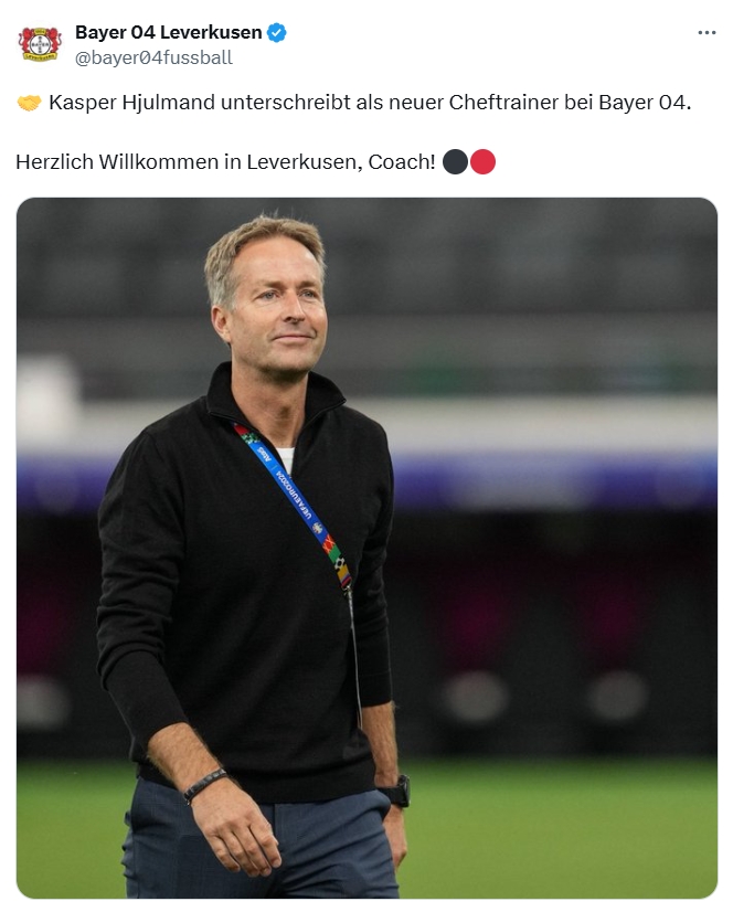 我們很高興地宣布,卡斯珀·尤爾曼德成為勒沃庫森的新任主帥!這位53歲的丹麥籍教練與我們簽署了一份有效期至2027年6月30日的合同。歡迎我們的新教練!