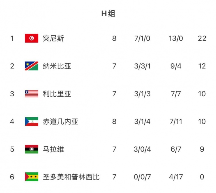 突尼斯8戰7勝1平積22分排名H組第一,提前鎖定小組第一并順利晉級世界杯。
