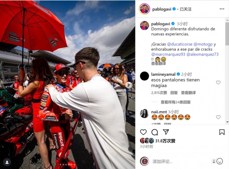 加維受邀現場(chǎng)觀(guān)看MotoGP加泰羅尼亞站比賽,他在社交媒體上曬出照片,配文:“不一樣的周日,享受全新的體檢?!?/p>
