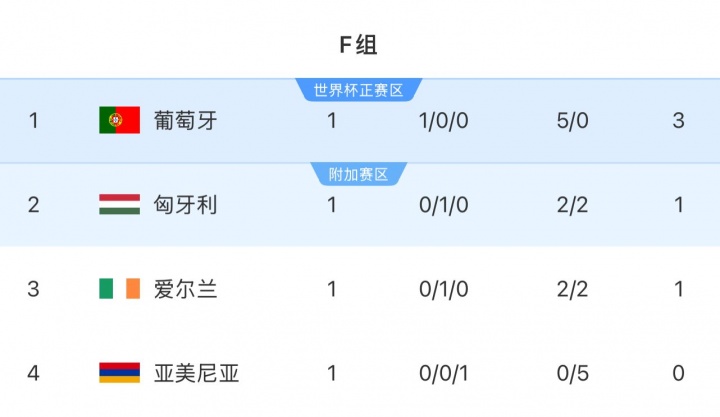 世預賽歐洲區,F組還剩5場(chǎng)比賽,葡萄牙的同組對手包括匈牙利、愛(ài)爾蘭和亞美尼亞。