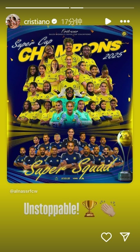 賽后,利雅得勝利男足球員C羅更新社媒為利雅得勝利女足送上祝福,他曬出奪冠海報,同時(shí)配文:勢不可擋!