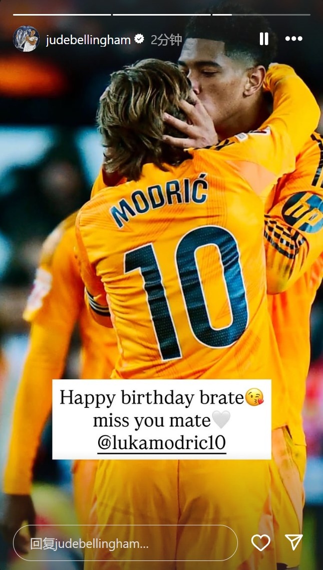 9月9日訊 今天莫德里奇迎來(lái)40歲生日,貝林厄姆在社媒曬照送祝福。