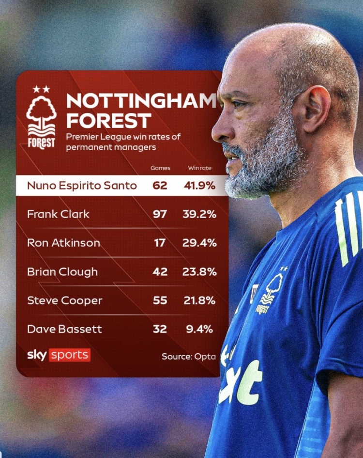 9月9日訊 諾丁漢森林官宣努諾下課,根據數據統計努諾是森林隊史英超勝率最高的主帥。
