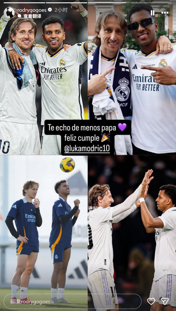 9月9日訊 莫德里奇迎來(lái)40歲生日,前皇馬隊友羅德里戈在個(gè)人社媒曬出多張兩人昔日合影為其慶生。