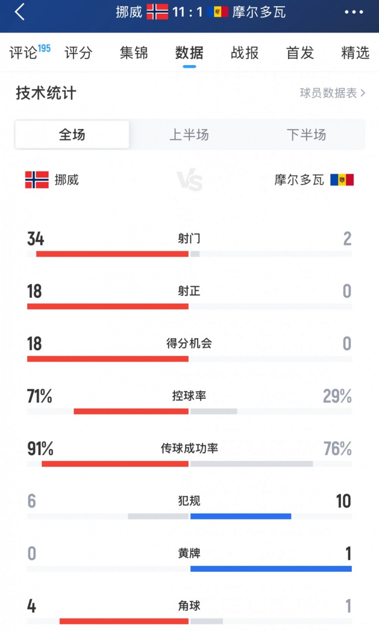 數據方面,主場(chǎng)作戰的挪威隊多項數據碾壓摩爾多瓦,具體如下(主隊挪威在前):