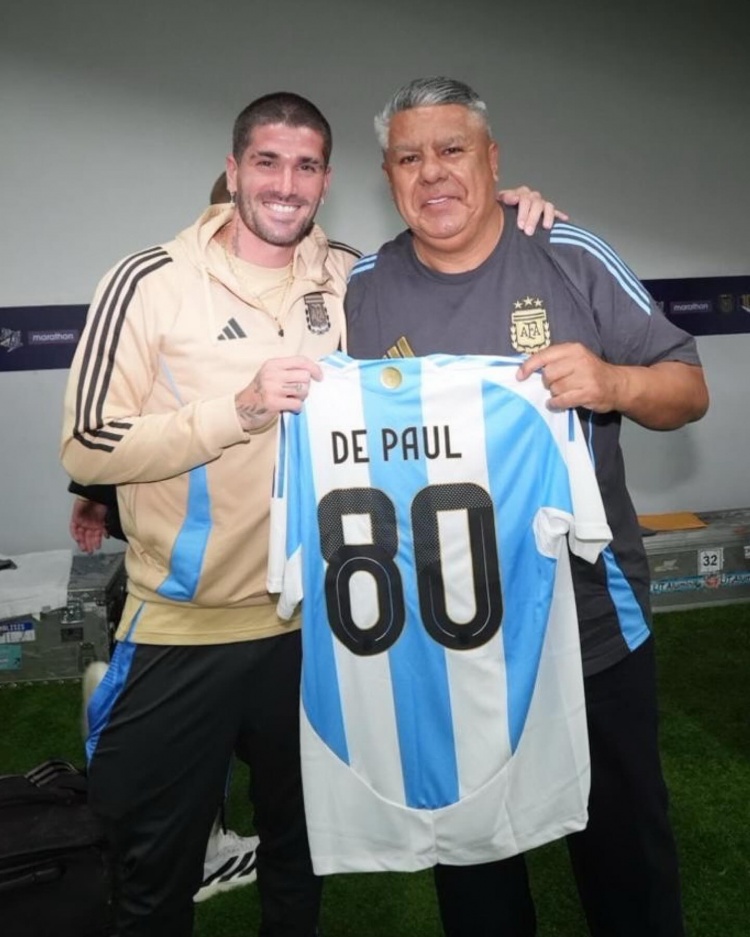 阿根廷足協(xié)主席塔皮亞賽后向德保羅頒發(fā)紀念球衣,祝賀他達成里程碑。