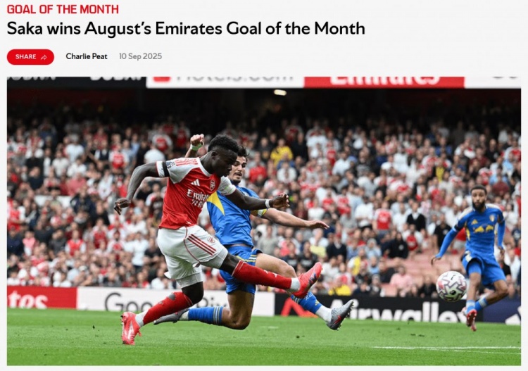 9月11日訊 阿森納官方消息,薩卡對陣利茲聯(lián)的抽射破門(mén)當選8月隊內最佳進(jìn)球。