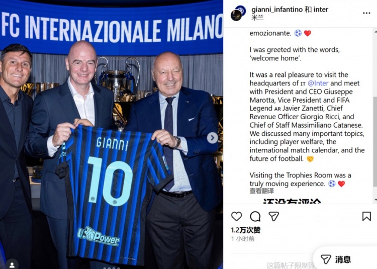因凡蒂諾寫(xiě)道:我這次的經(jīng)歷可以用“回家”來(lái)形容。非常榮幸能訪(fǎng)問(wèn)國米總部,并與俱樂(lè )部CEO馬洛塔、副主席兼國際足壇傳奇薩內蒂、首席營(yíng)收官喬治-里奇以及首席參謀馬克西米里亞諾-卡塔內塞會(huì )面。我們討論了許多重要議題,包括球員福祉、國際比賽日賽程以及足球的未來(lái)等等。參觀(guān)俱樂(lè )部榮譽(yù)室是一次深受觸動(dòng)的經(jīng)歷!