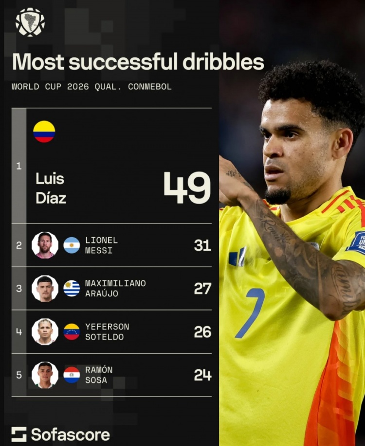 9月11日訊 南美世預賽戰罷,Sofascore統計了球員在本屆世預賽中的成功過(guò)人次數,并列出榜單,迪亞斯49次居首,梅西31次第二。