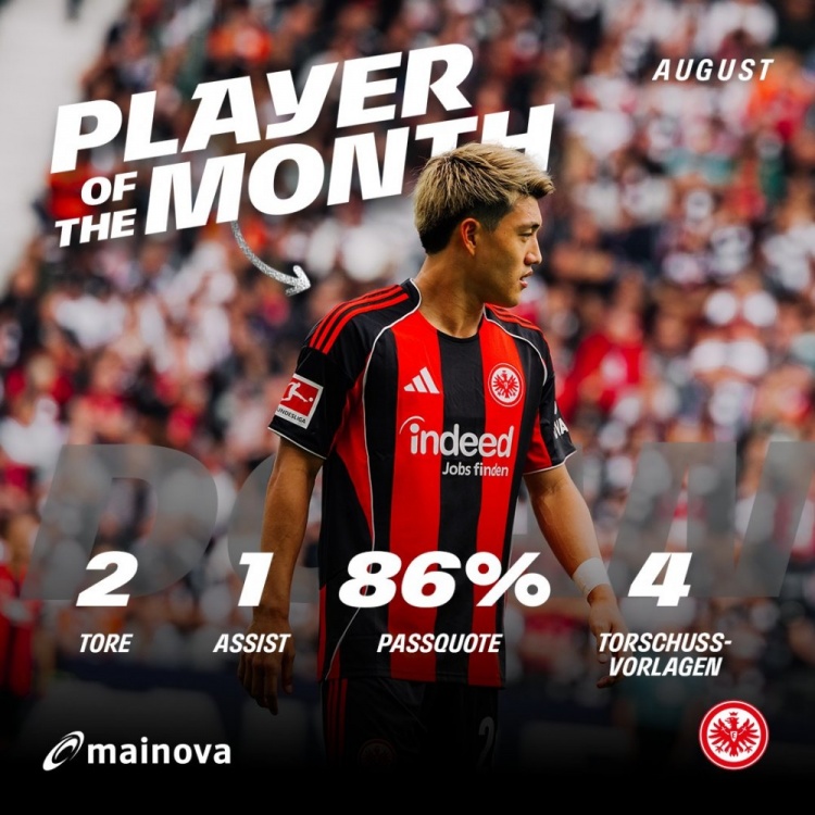 8月份堂安律共為法蘭克福出戰3場(chǎng)正式比賽,打入4球助攻1次,法蘭克福官方表示憑借在德甲第2輪球隊3-1擊敗霍芬海姆的比賽2射1傳的表現,堂安律當選8月最佳。