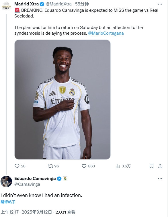 09月12日訊 此前據The Athletic記者M(jìn)ario Cortegana報道,皇馬中場(chǎng)卡馬文加預計將缺席客場(chǎng)對陣皇家社會(huì )的西甲聯(lián)賽。