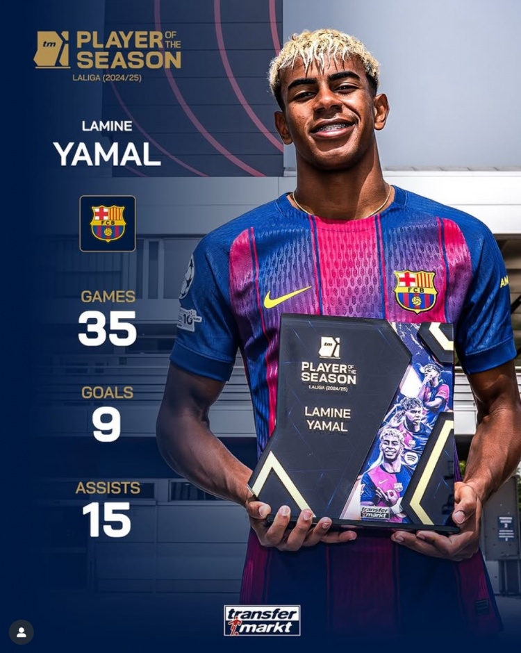 9月12日訊 《轉會(huì )市場(chǎng)》官方宣布,18歲的巴薩邊鋒亞馬爾當選德轉評選的24-25賽季西甲MVP。