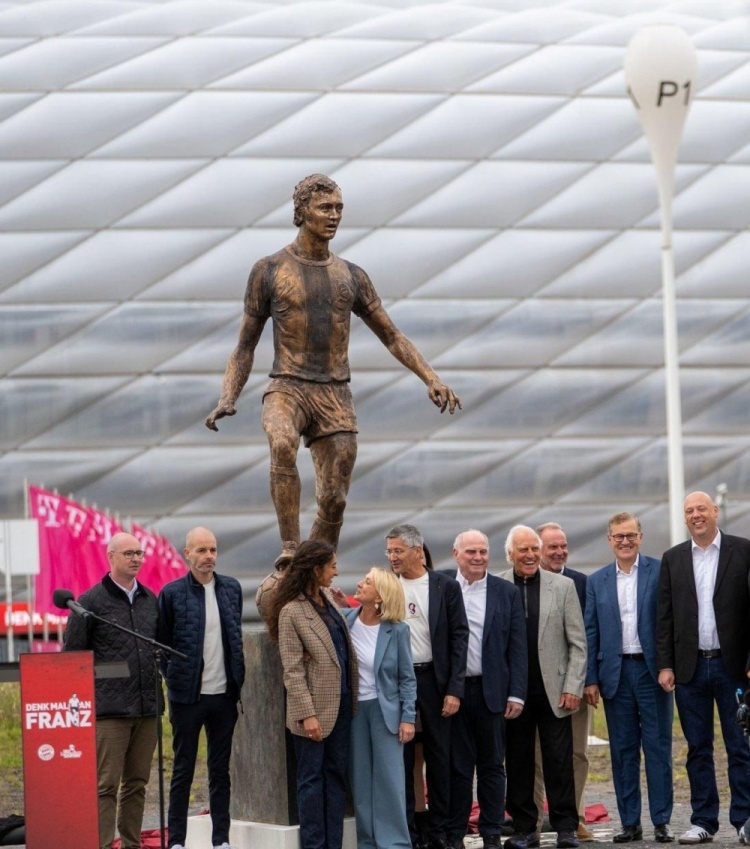 9月13日訊 安聯(lián)球場(chǎng)外的貝肯鮑爾雕像已經(jīng)揭幕,拜仁高層們一同在雕像前合影。