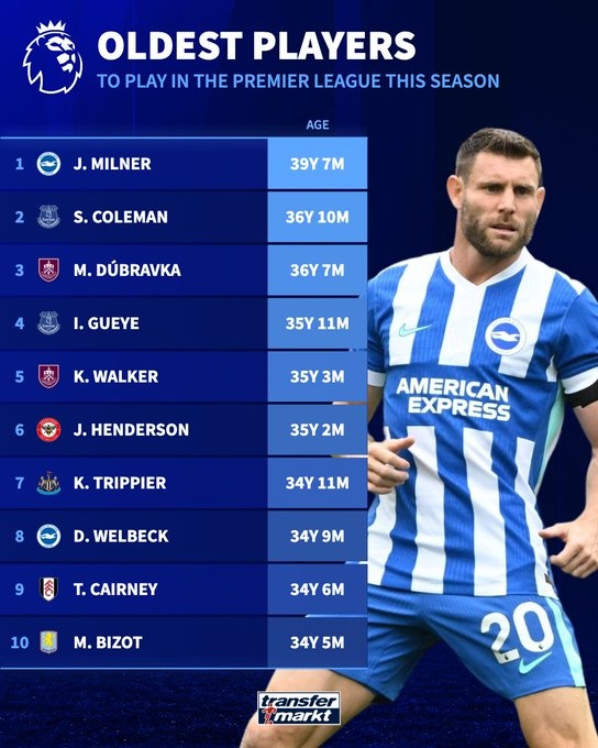 9月13日訊 德轉列本賽季英超截止目前出場(chǎng)最年長(cháng)球員排行,米爾納39歲7個(gè)月最年長(cháng),薩繆斯-科爾曼第二。