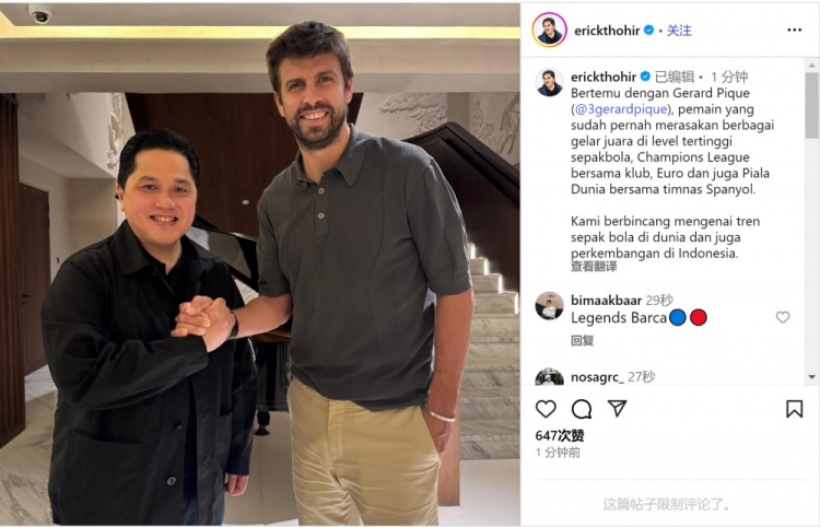 9月13日訊 印尼足協(xié)主席、前國米主席托希爾更新社媒動(dòng)態(tài),曬出與皮克的合照。