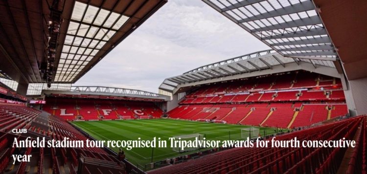9月13日訊 利物浦官方消息,安菲爾德球場(chǎng)及俱樂(lè )部博物館之旅連續第四年被Tripadvisor評為世界前10%的優(yōu)秀景點(diǎn)。
