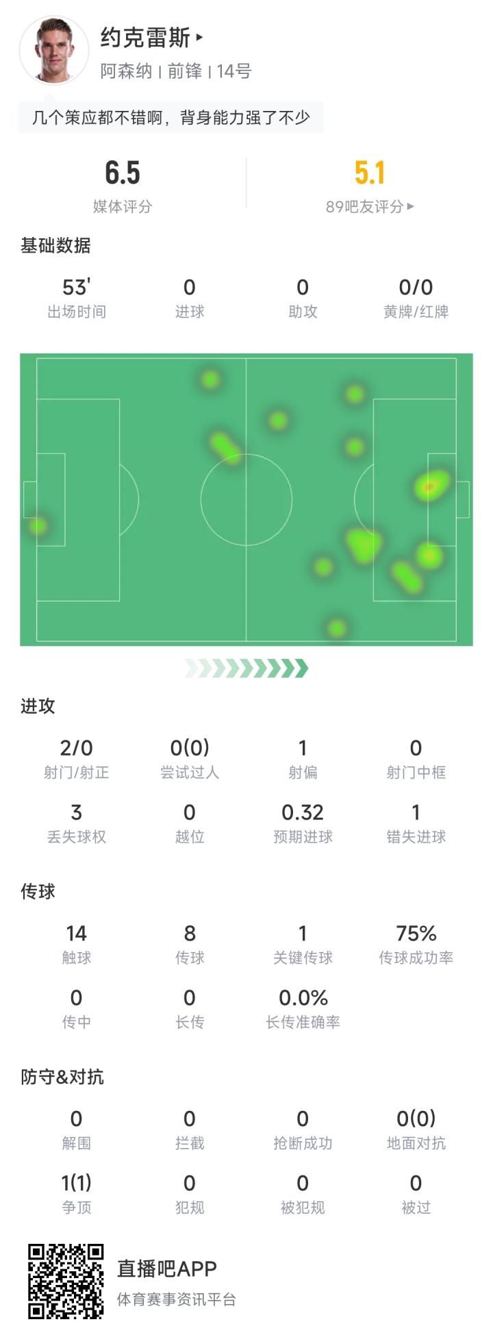 09月13日訊 英超第4輪,阿森納半場(chǎng)1-0領(lǐng)先諾丁漢森林,阿森納前鋒約克雷斯首發(fā)出戰,上半場(chǎng)數據如下。