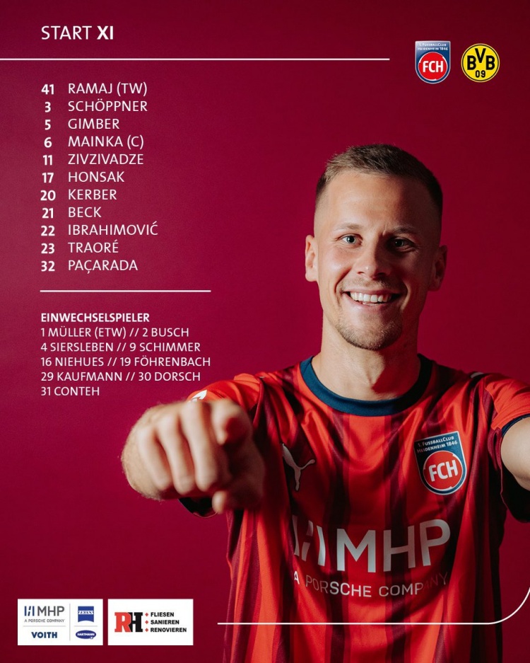 海登海姆首發(fā):41-拉馬伊、3-肖普納、5-吉姆博、6-梅恩卡、11-齊夫齊瓦澤、17-洪薩克、20-克伯、21-貝克、22-阿里揚-伊布拉希莫維奇、23-奧馬爾-特勞雷、32-帕恰拉達