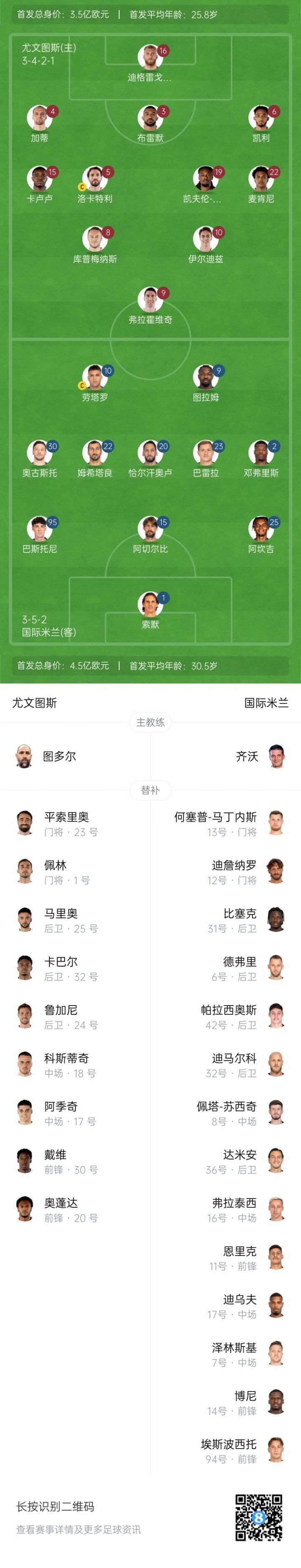 國米替補:12-迪詹納羅、13-何塞普-馬丁內斯、6-德弗里、7-澤林斯基、8-蘇西奇、11-路易斯-恩里克、14-博尼、16-弗拉泰西、17-迪烏夫、31-比塞克、32-迪馬爾科、36-達米安、42-帕拉西奧斯、94-皮奧-埃斯波西托
