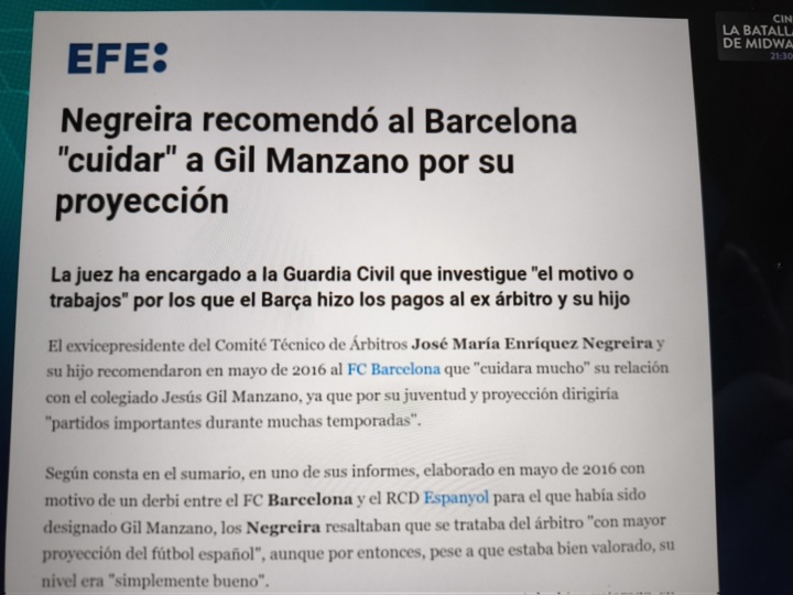 根據案卷記錄,在2016年5月針對希爾-曼薩諾執法的巴薩對陣西班牙人德比戰所撰寫(xiě)的報告中,內格雷拉父子強調該裁判是西班牙足球界最具發(fā)展潛力的裁判,盡管當時(shí)其雖獲積極評價(jià),但執法水平僅屬良好。